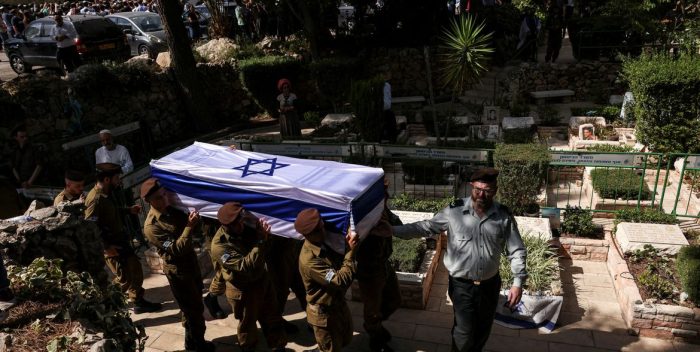 Soldiers carry the coffin of Adi Zur, a soldier who was slain in the assault on Israel by Hamas gunmen from the Gaza Strip, at their funeral at Mount Herzl Military Cemetery in Jerusalem, October 11, 2023. REUTERS/Ronen Zvulun