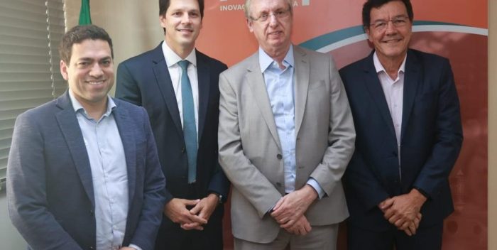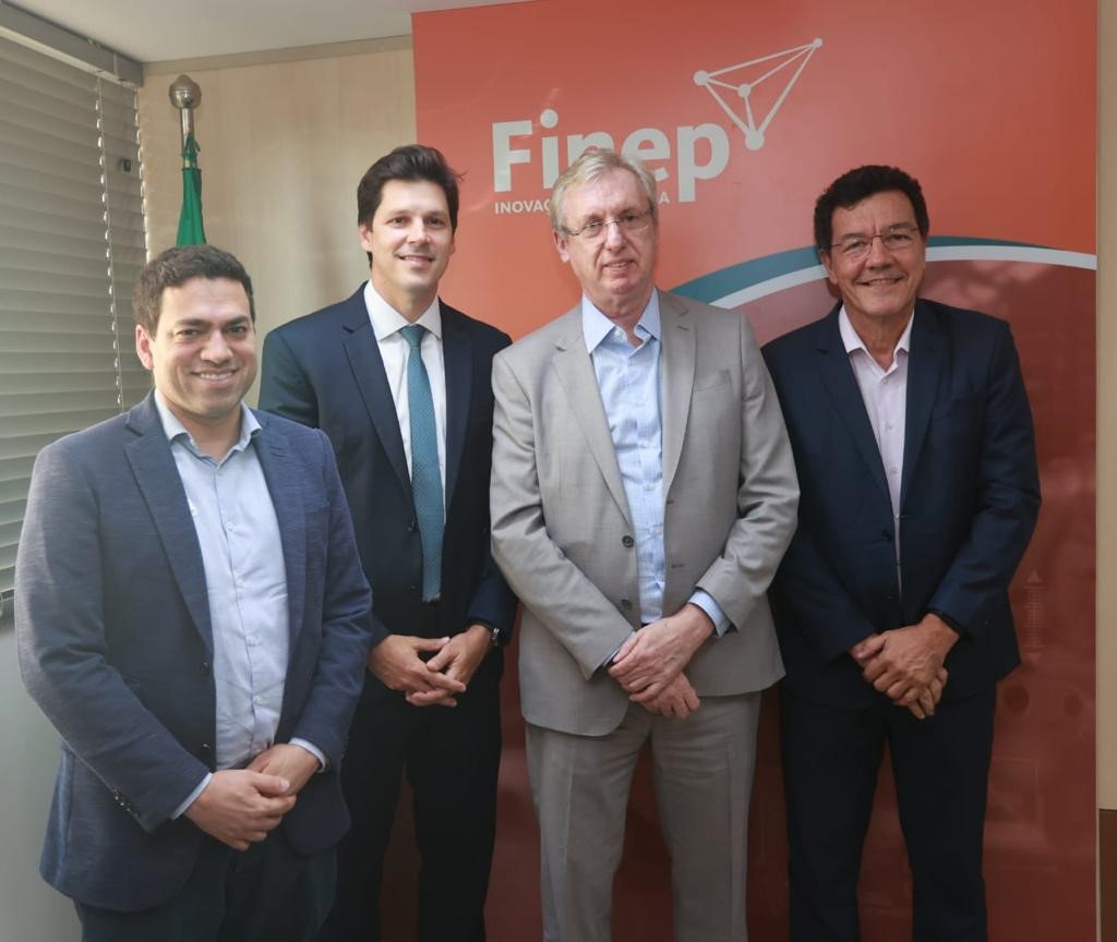 Governador em exercício, Daniel Vilela articula investimentos em Inteligência Artificial com o presidente da Finep, Celso Pansera. Ao lado deles (à esquerda), o titular da Sect), José Frederico Lyra Netto, e o ex-reitor da UFG e atual assessor da presidência da Finep, professor Edward Madureira (Fotos: André Costa)