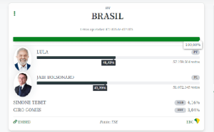 O ex-presidente Luiz Inácio Lula da Silva terminou em primeiro, com 48,43% dos votos, o equivalente a 57.259.504, enquanto o presidente Jair Bolsonaro, que tenta a reeleição, ficou com 43,2%, o equivalente a 51.072.345 votos. Os dois disputam o segundo turno, marcado para 30 de outubro.