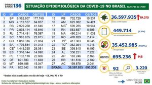 Desde o início da pandemia, o país acumula 36,5 milhões de casos confirmados da doença e 695,2 mil mortes. O número de pacientes recuperados soma 35,4 milhões.