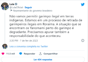 No post, o presidente ressaltou que há 840 pistas de voo clandestinas, das quais 75 são perto de terras Yanomami. “Não é possível não enxergar isso. Quem permitiu isso, tem que ser responsabilizado”, disse Lula.