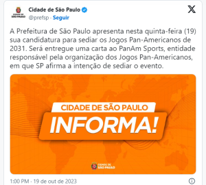 A prefeitura de São Paulo anunciou nesta quinta (19) que enviará uma carta à PanAm Sports – organização responsável pelos Jogos Pan-Americanos – reiterando a intenção de sediar a edição de 2031 do evento. O documento será entregue pelo secretário municipal de Esportes da capital paulista, Cacá Viana. O dirigente se reunirá com o presidente da entidade internacional, o chileno Neven Ilic, em Santiago, onde serão inaugurados amanhã os Jogos de 2023.