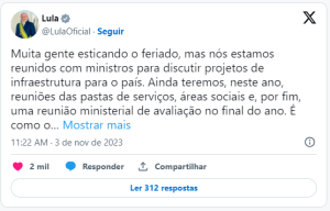 O presidente usou as redes sociais para falar sobre a reunião. “Muita gente esticando o feriado, mas nós estamos reunidos com ministros para discutir projetos de infraestrutura para o país. Ainda teremos, neste ano, reuniões das pastas de serviços, áreas sociais e, por fim, uma reunião ministerial de avaliação no final do ano”, disse ele por meio do X (antigo Twitter).