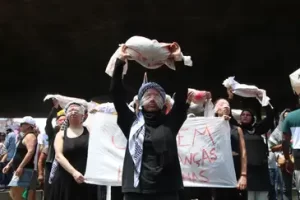 Uma performance de mulheres simulando carregar crianças mortas em panos manchados de vermelho chamou atenção do público. A ideia é denunciar o elevado número de óbitos de crianças pelos bombardeios de Israel.