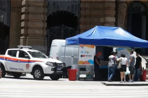 Prefeitura de São Paulo distribui água no Vale do Anhangabau, onde os termômetros marcaram 39 °C nesta terça-feira (14) – Paulo Pinto/Agência Brasil